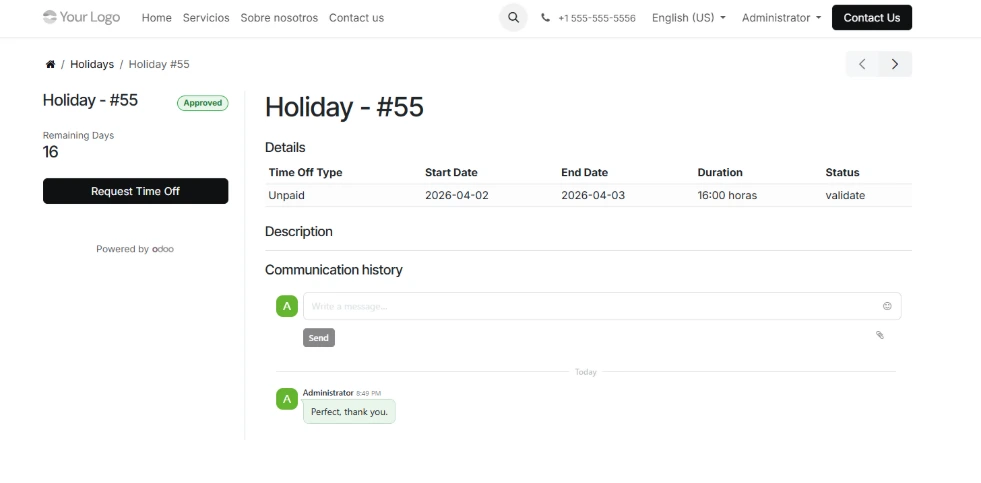 Capturas reales del módulo GM Portal Holidays integradas en el entorno estándar de Odoo. Visualiza cómo los empleados pueden realizar sus solitudes de ausencias o editar desde el portal y consultar su historial de ausencias como realizar comunicaciones con responsables.